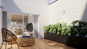 17.5帖の開放的なLDKからフラットに繋がる中庭は、家族のセカンドリビングとして機能。外からの視線を気にせずBBQや読書が楽しめるプライベートな空間です。