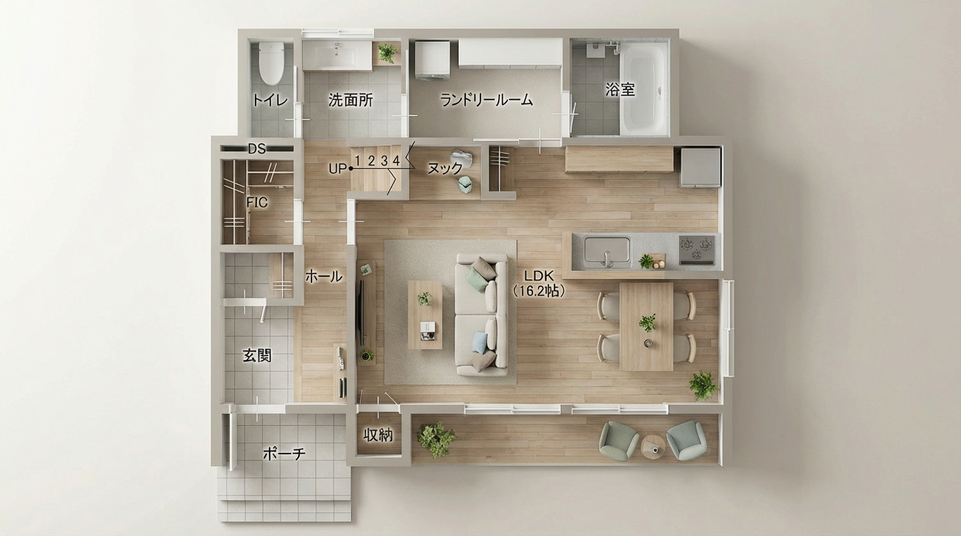 本住宅は、玄関ホール→洗面室→ランドリールーム→キッチンへとつながる回遊動線を採用しており、日々の家事を効率化。洗濯や掃除の動線がコンパクトにまとまっているため、忙しい毎日をスマートにサポートします。