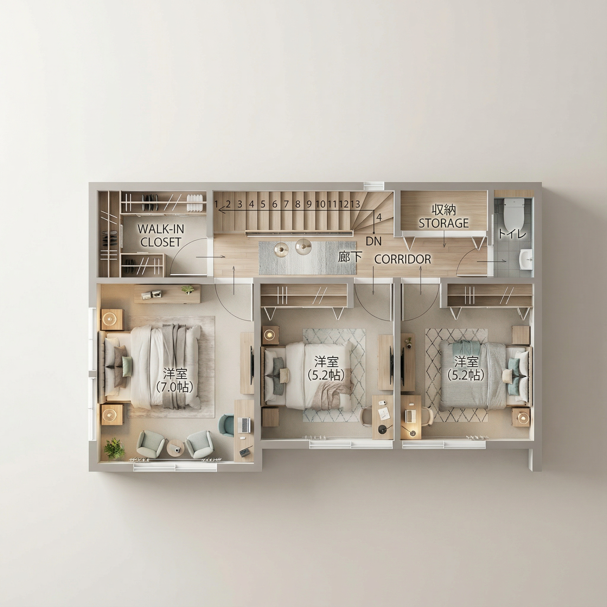 1階には各所に収納スペースを確保し、生活動線上に“しまう場所”が存在。さらに2階には3部屋を備え、ウォークインクローゼットを含む各部屋に収納をしっかり配置。
