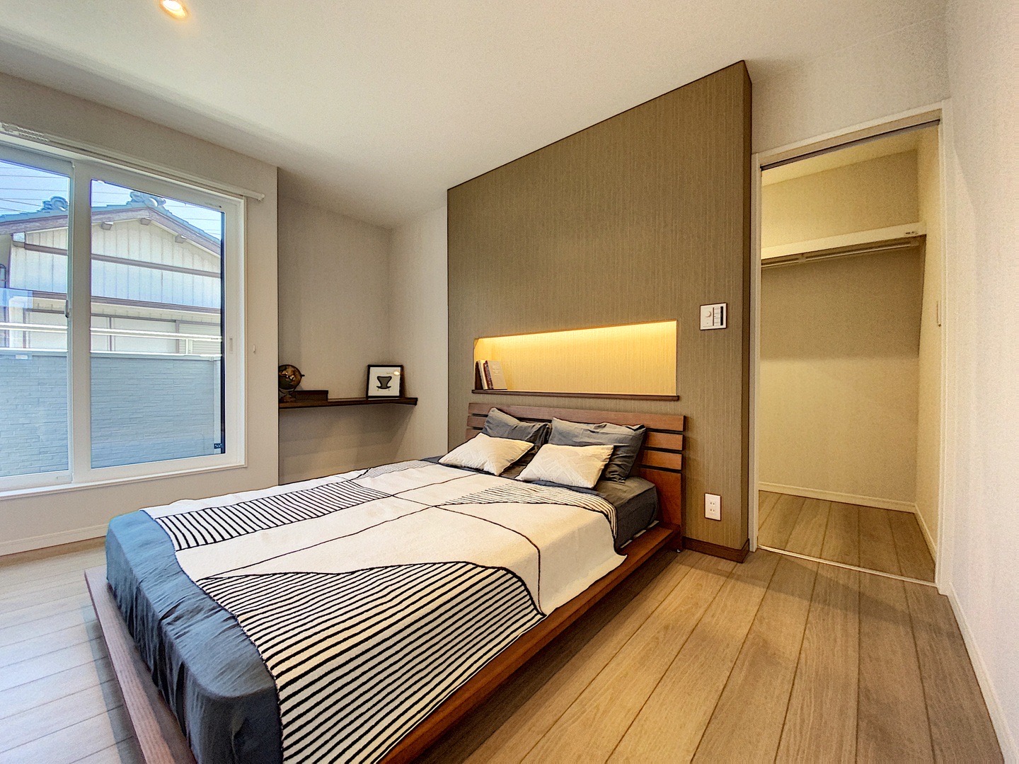 間接照明が落ち着く寝室。奥には大型のウォークインクローゼットがあります。
