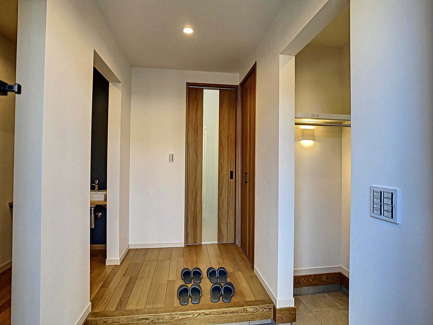 ゆったりとした玄関には、光触媒で除菌のできるクリーンルーム、シューズクローク、手洗い場を設置。細部までこだわりぬきました。