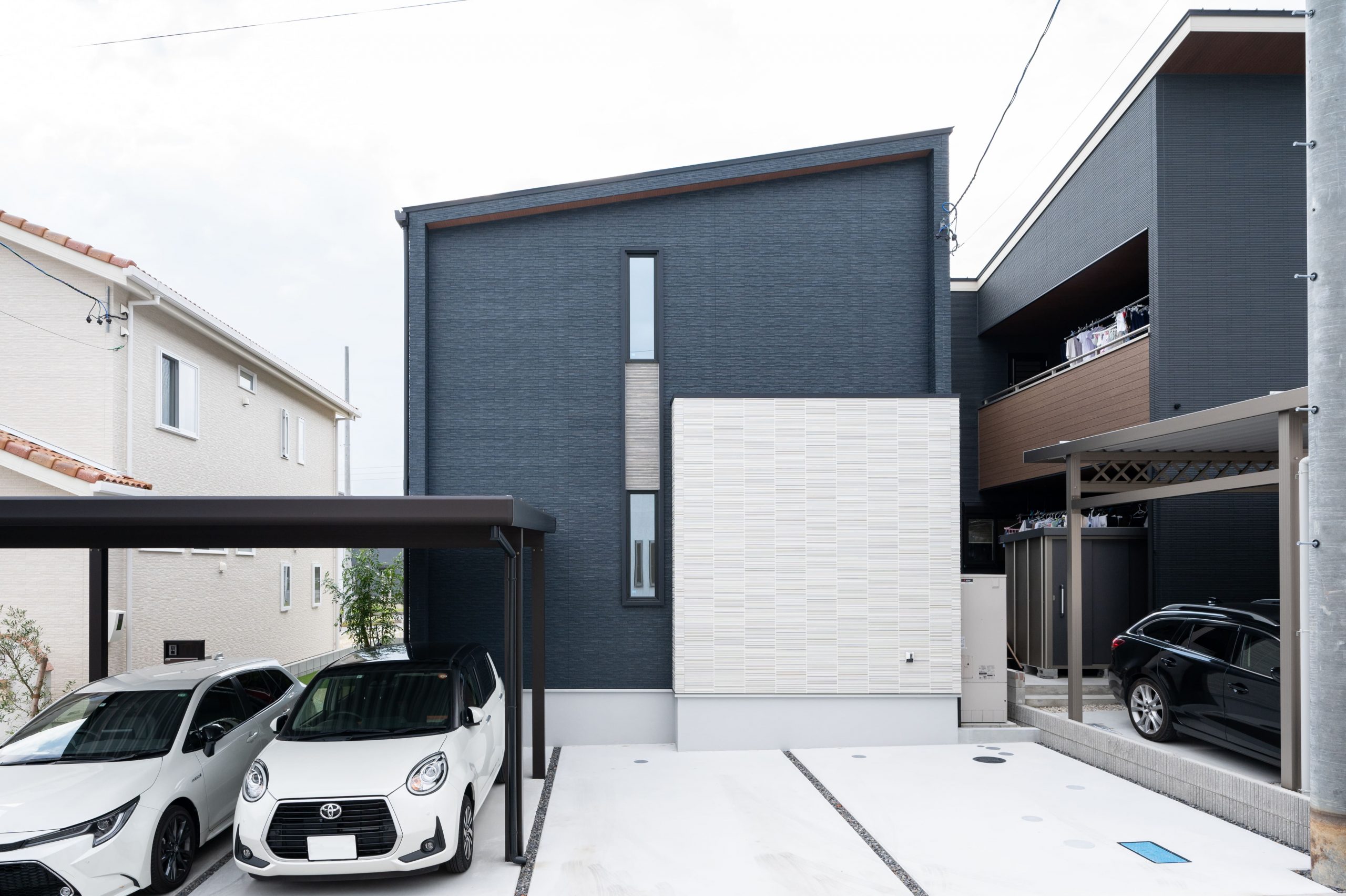 ネイビーのスタイリッシュな外観に、アクセントの赤の玄関で高級感が出ます。