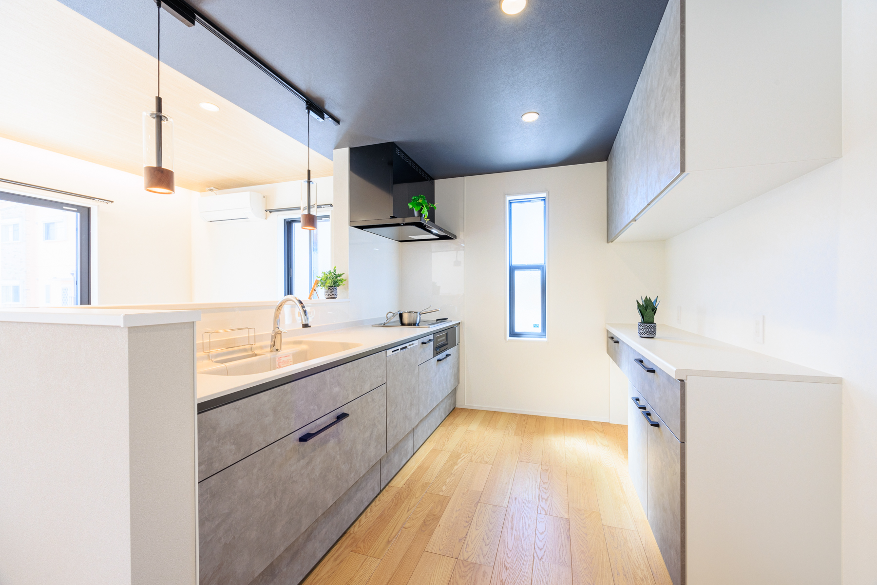 キッチンから家族の共有スペースを見渡せるので、家事をしながら会話をしたり、テレビを見たりできる間取りになっています。