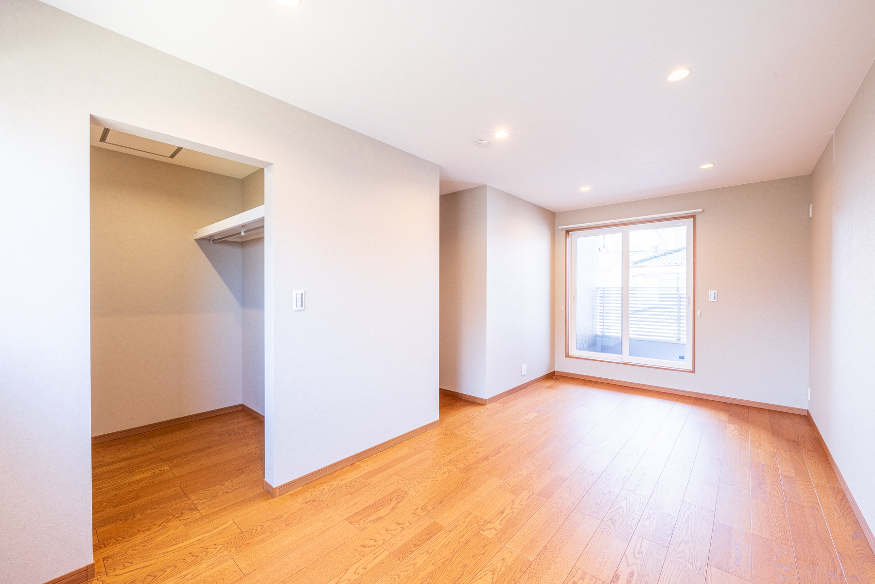 南向きの窓から射し込む光で、毎日爽やかに目覚められる主寝室。隣には、中でも着替えが可能な大型ウォークインクローゼットが備え付けられています。 -