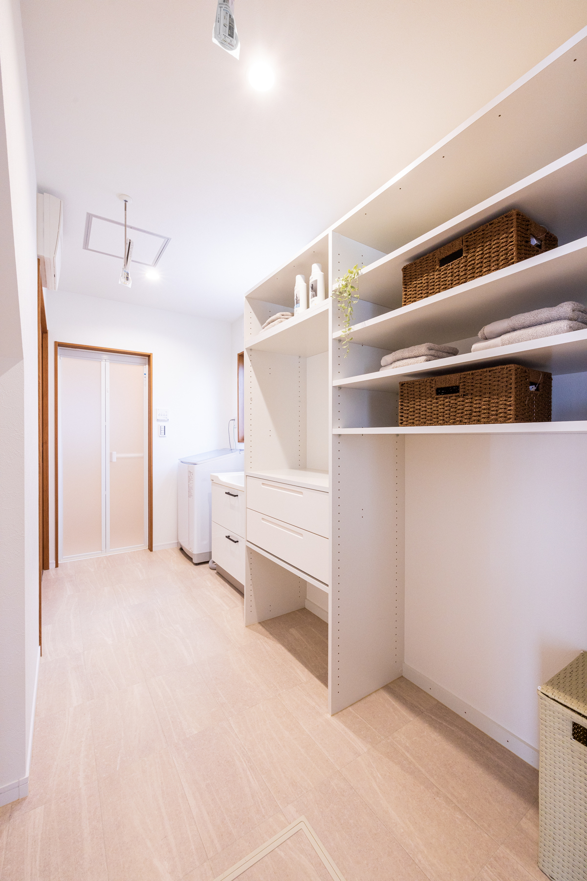 広々とした洗面脱衣スペース。室内干しユニットと収納棚が備え付けてあるので、「洗う→干す→しまう」の一連作業がここだけで完結します。 -