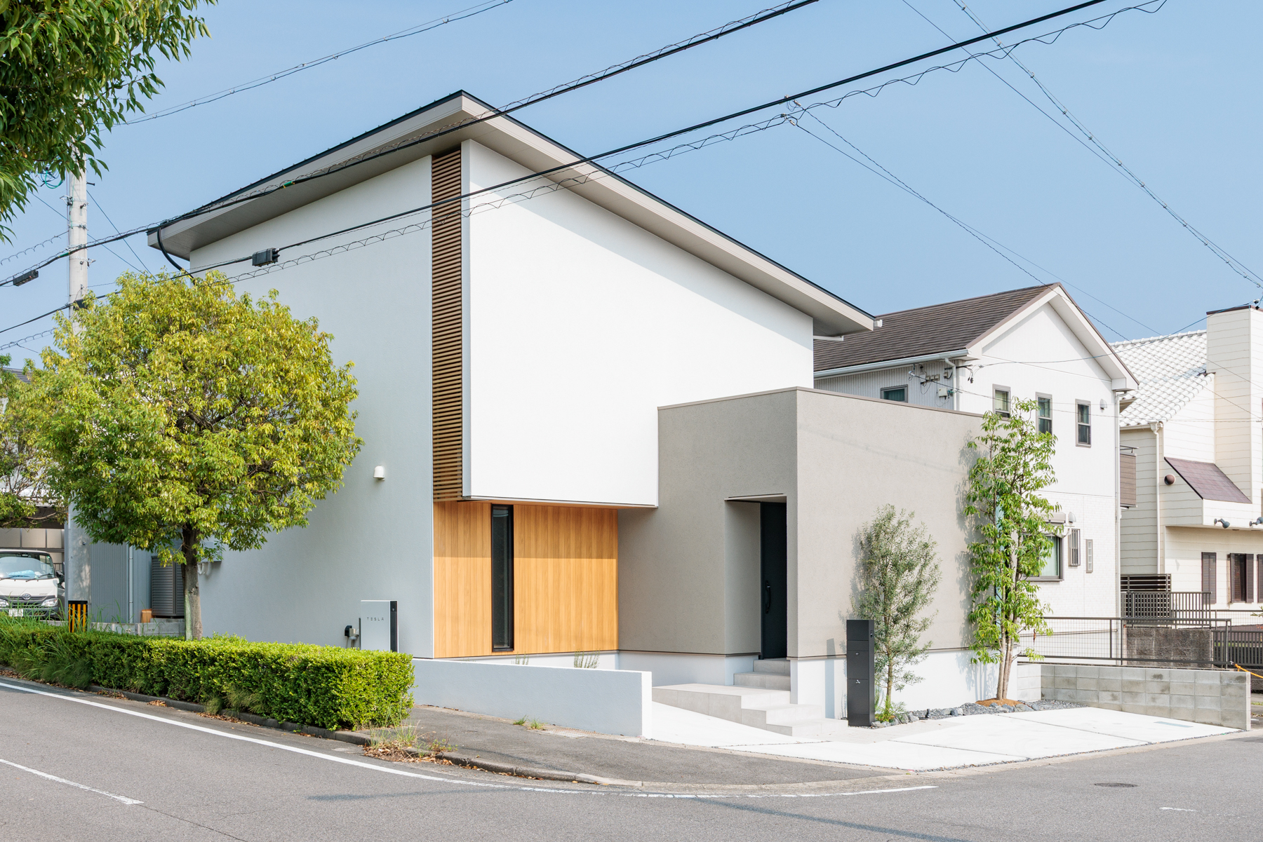 道路側からの視線を遮るクローズドな外観ながら、スリット窓や縦格子から光と風を効果的に採り入れる設計。エントランス部分をグレーのボックスで際立たせることで、視覚的なアクセントと奥行きを演出しています。