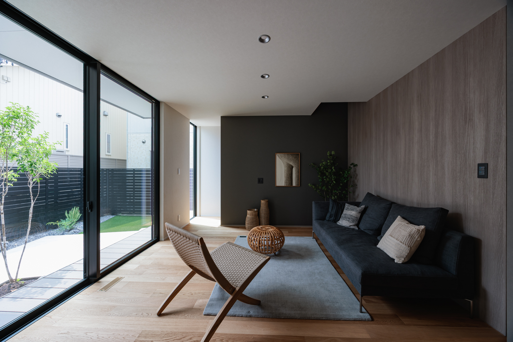 インテリア好きの憧れ、ACTUSの家具でトータルコーディネートされた24帖のLDK。選び抜かれた家具の質感に合わせ、壁面には木のパネルとグレーのアクセントを配し、美術館のような静寂さと温かみを感じる空間に仕上げました。本物志向の家具が、日々の暮らしをワンランク上のステージへと導きます。