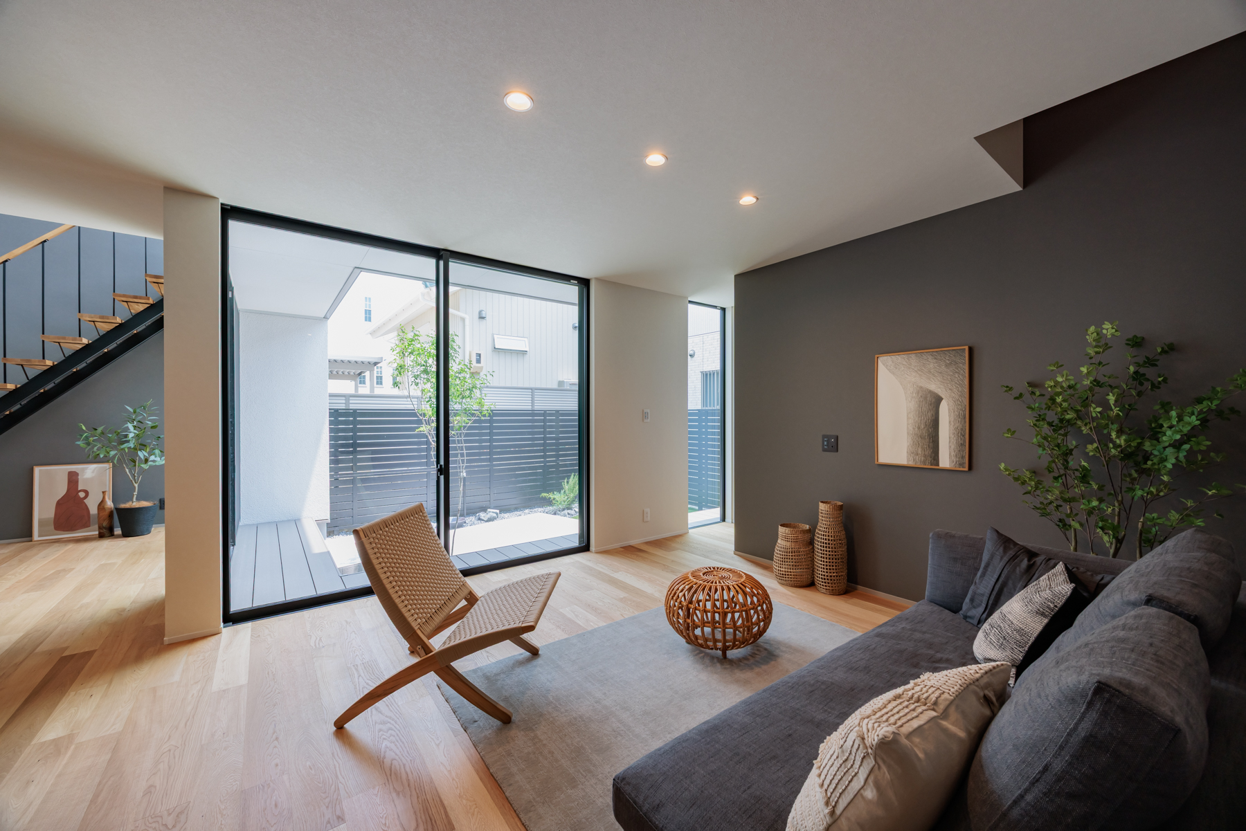 大開口の窓からフラットに続くウッドデッキが、リビングに圧倒的な開放感をもたらします。自然光を浴びて表情を変える木目の床や家具の美しさを楽しみながら、外とのつながりを感じてゆったりと寛げる、贅沢なリビング設計です。