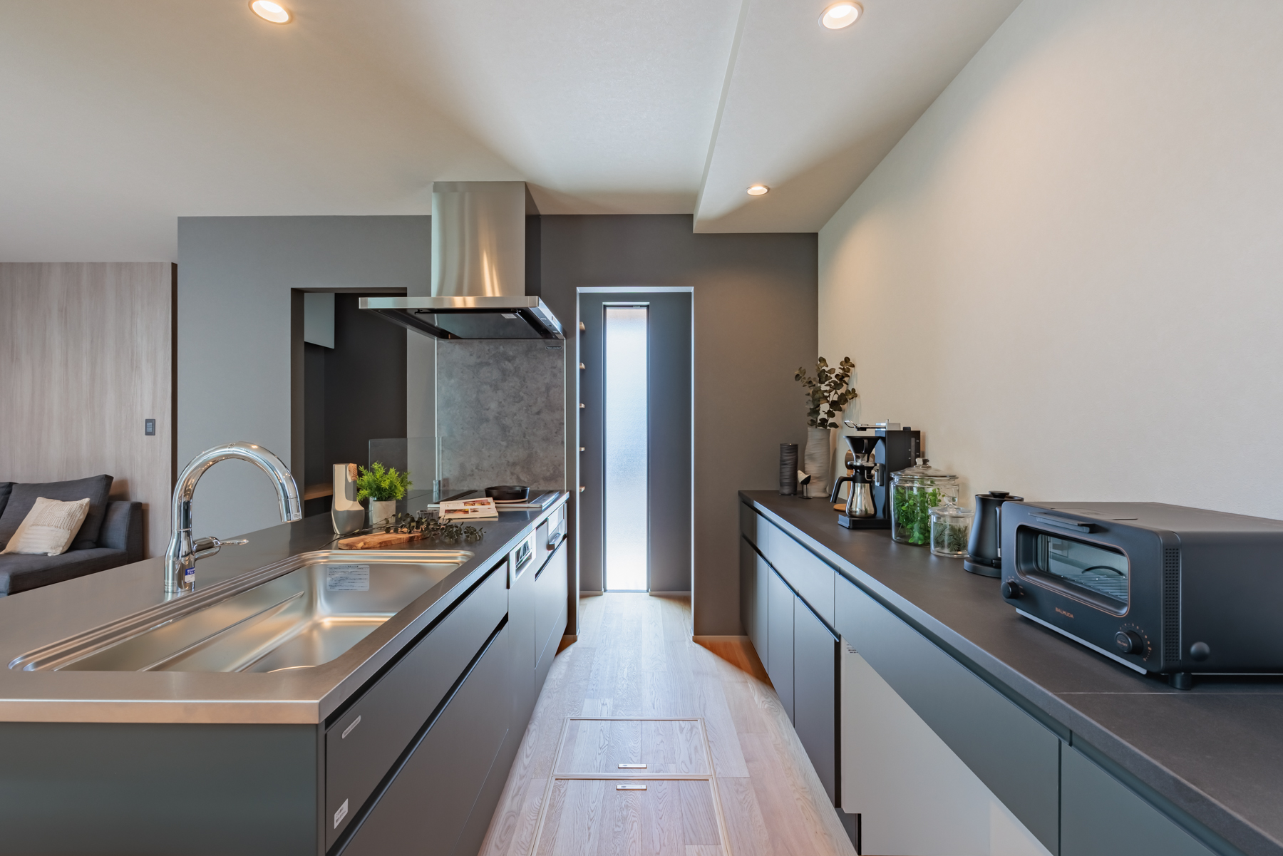 洗練された黒のキッチンには、利便性と衛生面に優れたタッチレス水栓を採用。さらに、家中すべての水をクリーンに保つ「ウルトラファインバブルSUIGEN」を導入しました。微細な泡が、料理や洗い物からお風呂まで、暮らしのあらゆるシーンに上質な水源を届けます。美しさと健やかさが共生する、こだわり抜いた住まいです。 -