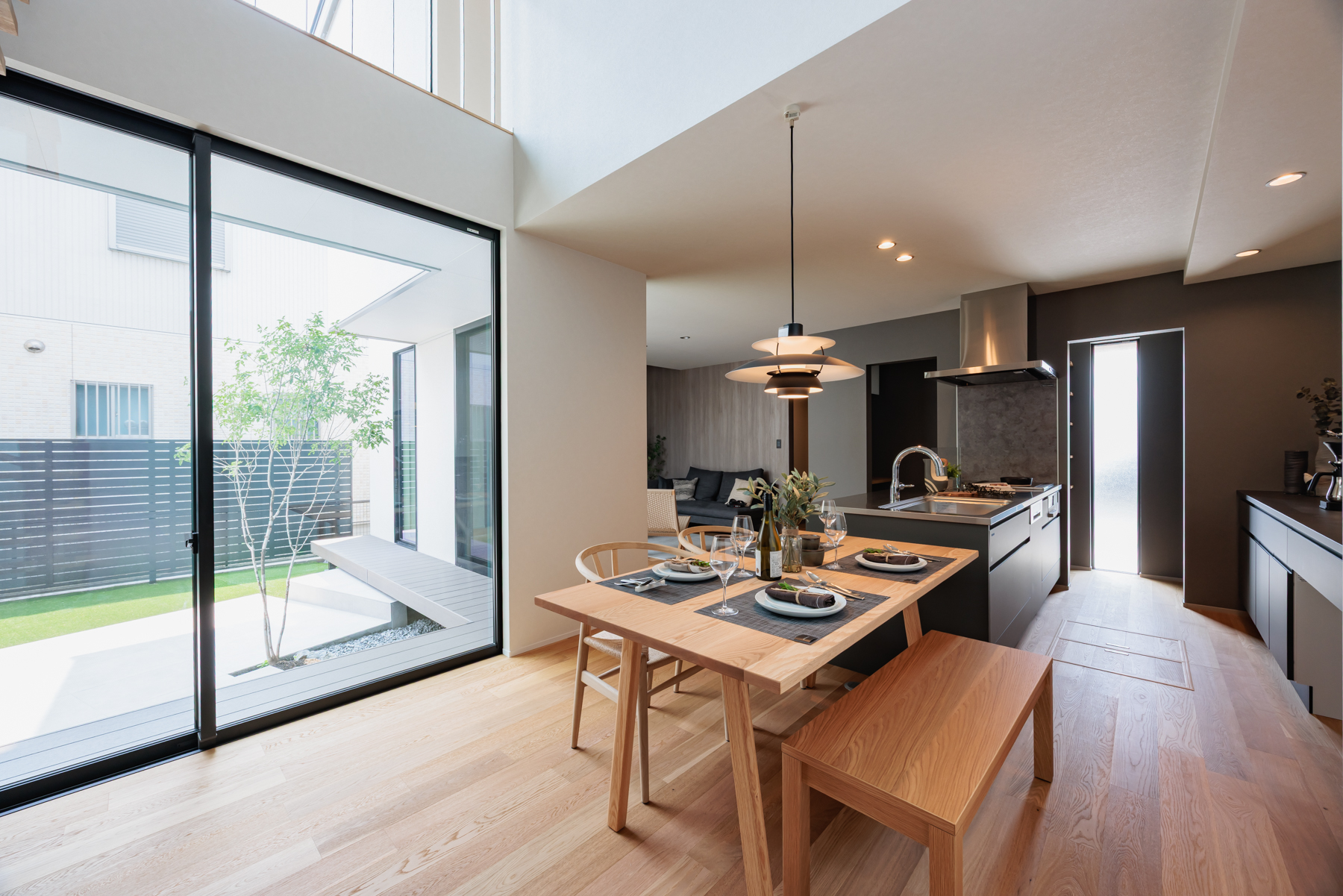 キッチンとダイニングを横並びに配し、配膳や片付けがスムーズな「家事楽動線」を実現しました。大開口の窓から差し込む豊かな光と中庭の緑が、開放感あふれる食卓を演出します。