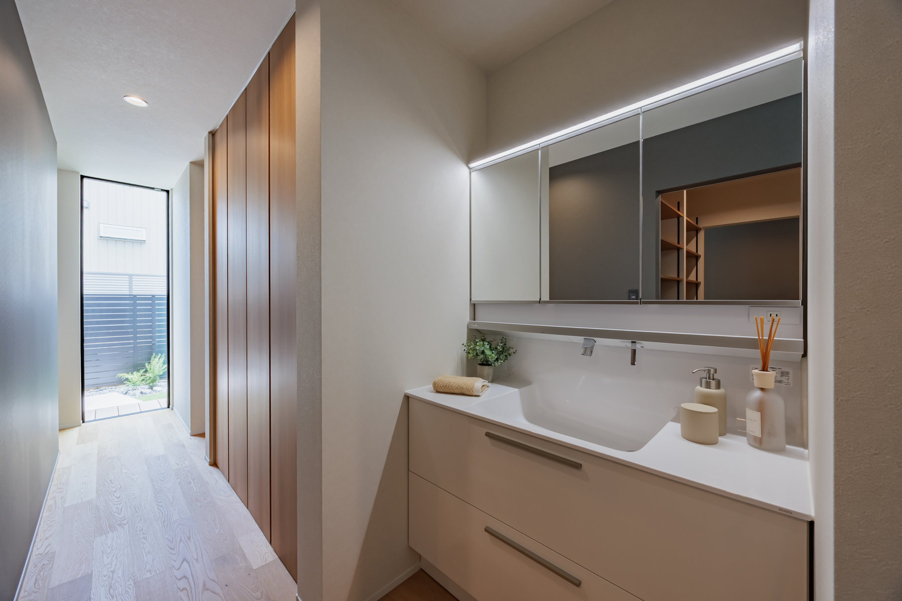 北側の庭から差し込む柔らかな光が、白を基調とした空間と明るい木目の床に反射し、部屋全体をいっそう明るく清潔感たっぷりに演出します。廊下沿いには壁一面の大容量収納を完備し、洗面台もゆとりある広さを確保。機能的でありながら、毎朝の身支度が心地よい時間へと変わる、開放感あふれる設計です。